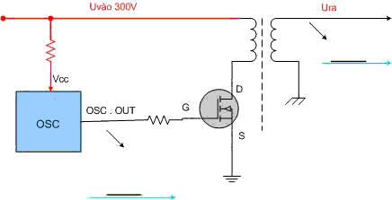 Mosfet được sử dụng làm đèn công xuất nguồn Monitor Trong bộ nguồn xung của Monitor hoặc máy vi tính, người ta thường dùng cặp linh kiện là IC tạo dao động và đèn Mosfet, dao động tạo ra từ IC có dạng xung vuông được đưa đến chân G của Mosfet, tại thời điểm xung có điện áp > 0V => đèn Mosfet dẫn, khi xung dao động = 0V Mosfet ngắt => như vậy dao động tạo ra sẽ điều khiển cho Mosfet liên tục đóng ngắt tạo thành dòng điện biến thiên liên tục chạy qua cuộn sơ cấp => sinh ra từ trường biến thiên cảm ứng lên các cuộn thứ cấp => cho ta điện áp ra. * Đo kiểm tra Mosfet trong mạch