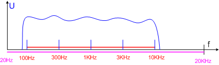 4. Mạch Graphic Equalizer Equalizer là mạch điều chỉnh sự cân bằng tín hiệu giữa các tần số trong giải tần âm thanh, còn gọi là mạch điều chỉnh âm sắc, đơn giản nhất của mạch Equalizer là mạch Bass Treec với hai núm chỉnh, thông thường mạch Equa lizer có 5 cần gạt chỉnh cho 5 vùng tần số là 100Hz, 300Hz, 1KHz, 3KHz và 10KHz. Từ kiến thức vật lý PTTH ta biết rằng, âm thanh con người nghe được có giải tần từ 20Hz đến 20KHz và gọi là tín hiệu âm tần, tần số nhỏ hơn 20Hz gọi là hạ tần, tần số từ 20KHz đến 30KHz gọi là sóng siêu âm, còn tần số trên 30KHz là sóng cao tần. Giải tần âm thanh mà con người có thể cảm nhận từ 20Hz đền 20 KHz nhưng các thiết bị âm thanh thường bị hạn chế về mặt tần số. Thí dụ đài Cassette thường chỉ truyền đạt được giải tần từ 50Hz đến 10 KHz, Điện thoại di động chỉ truyền đạt được giải tần từ 300Hz đến 3KHz, các thiết bị cho dải tần tốt là đầu đĩa CD, máy nghe nhạc kỹ thuật số.