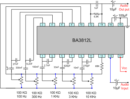 Sơ đồ mạch Equalizer 5 cần gạt sử dụng IC Bạn có thể thiết kế mạch Equalizer 5 cần gạt như các thông số của sơ đồ trên, sau đó bạn có thể sử dụng vào tăng âm hoặc bộ kích cho loa thùng.., nguồn điện nuôi Vcc cho IC là 6V DC. 4.3 - Phương pháp kiểm tra sửa chữa tầng Equalizer Khi hỏng tầng Equaizer thường sinh ra các hiện tượng như . Mất âm thanh ra loa trong khi băng vẫn quay, hoặc âm thanh nói nhỏ, hoặc điều chỉnh các cần gạt ít tác dụng. Kiểm tra :