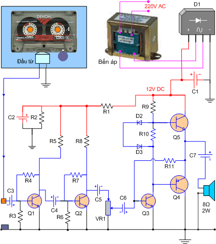 Bạn đọc hãy tự lắp một chiếc Cassette theo sơ đồ mạch dưới đây, sau