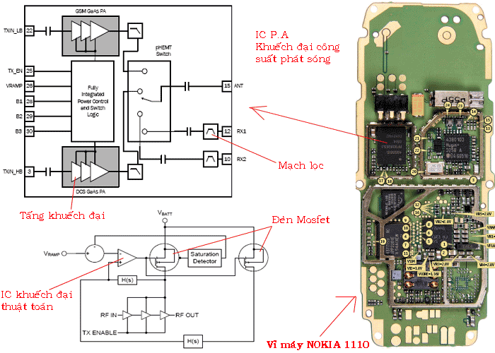 Ứng dụng của Mosfet : - Trong điện thoại di động, Mosfet được sử dụng trong IC xạc điện cho Pin, trong IC khuếch đại công suất phát và trong IC điều khiển chiếu sáng màn hình, bàn phím.