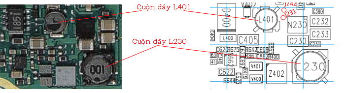 Một số cuộn dây có hình trụ quấn trên lõi Ferit như cuộn dây L401 và L230 ở hình trên