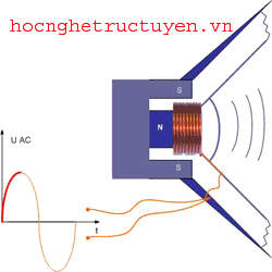 Cấu tạo của loa: - Loa có một cuộn dây hình trụ đặt giữa hai cực của một nam châm vĩnh cửu, từ trường của nam châm tương đối mạnh, khi ta cho dòng điện chạy qua cuộn dây, cuộn dây sẽ tạo ra một từ trường và từ trường của cuộn dây sẽ bị từ trường của nam châm đẩy làm cho cuộn dây chuyển động, nếu ta đưa dòng điện xoay chiều chạy qua cuộn dây thì cuộn dây sẽ chuyển động quanh vị trí cân bằng. Nếu ta cho dòng điện có tần số 1000Hz chạy qua cuộn dây thì cuộn dây sẽ dao động với tần số 1000Hz - Người ta gắn cuộn dây với một chiếc màng cứng ta sẽ được một chiếc chuông (chuông điện thoại), nếu ta gắn cuộn dây với một chiếc màng bằng giấy ta sẽ được một chiếc loa, khi màng loa dao động ở tần số cao nó sẽ phát ra âm thanh - Micro cũng có cấu tạo giống loa nhưng cuộn dây quấn nhiều vòng hơn, trở kháng của cuộn dây cao hơn, màng của Micro mỏng hơn để dễ dàng rung động khi có sóng âm thanh tác động tới, khi có sóng âm thanh, màng micro rung lên, cuộn dây dao động trong từ trường và tạo ra điện áp cảm ứng cho ta tín hiệu âm tần.