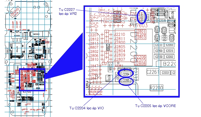 - Đặt que đo vào đầu các tụ C2227 để đo áp VR2, C2204 để đo áp VIO