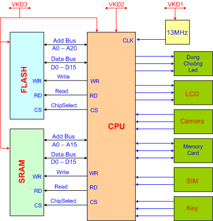 CPU và các IC nhớ FLASH, SRAM trao đổi với nhau thông qua ba hệ thống